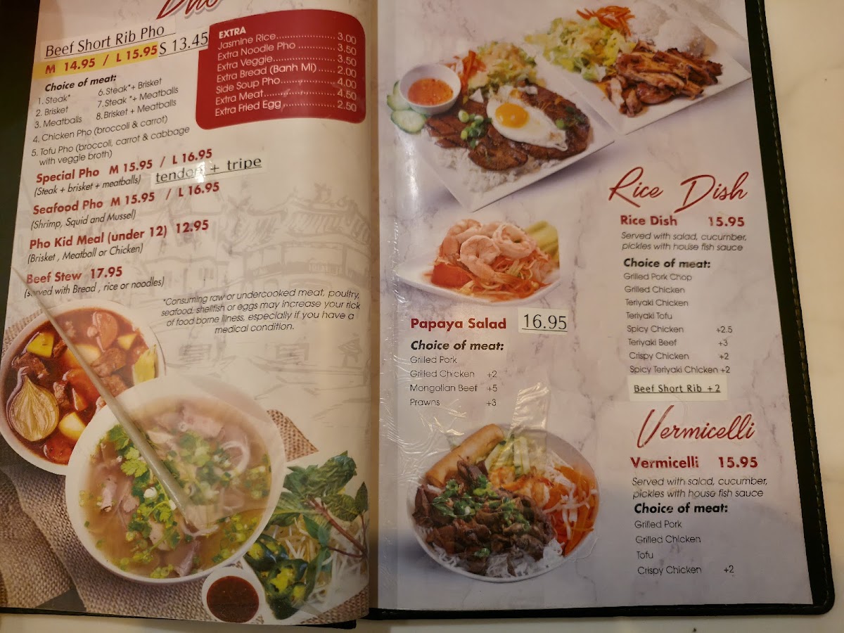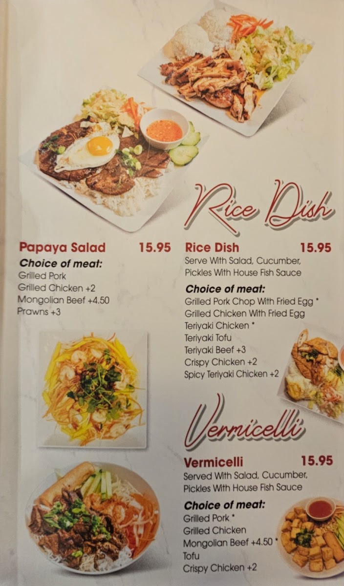 The menu at Hello Pho features a diverse selection of Asian and Vietnamese dishes, including a variety of pho options, noodle plates, and Asian fusion specialties. Diners can explore multiple categories such as Chef Specials, Vermicelli dishes, and Curry selections, providing a broad range of flavors and ingredients to suit different preferences.